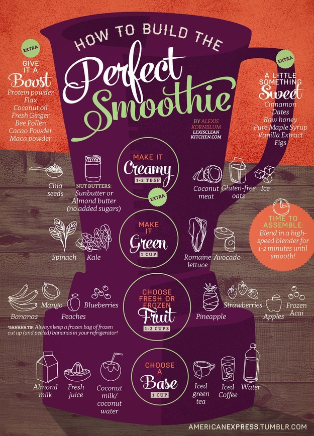 I came across this helpful infographic to making some delicious smoothies and thought I would share it with you. Please give them a try them and let me know if you have any variations that worked for you.
