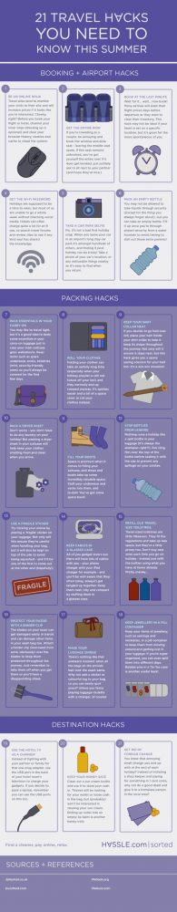 The early morning rise sometimes results in us having little or no time left before its off to the airport. On my last trip to Abu Dhabi , I realized how important it is to have a checklist before departure. I came across this ’21 Travel hacks you need to know this summer’ infographic o Hassle.com and I know these tips will be useful this holiday season.