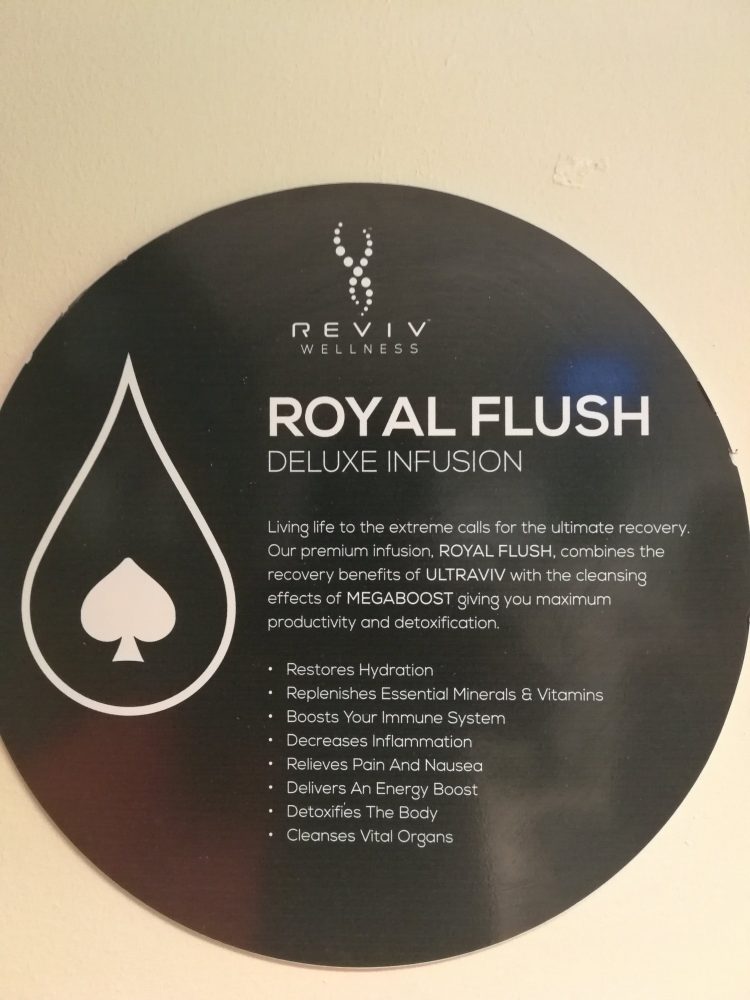 REVIV offers other phenomenal treatments such Hydromax– which is best for optimal athletic performance and dehydration, Ultraviv– best for recovery from illness, hangovers and seasonal allergies and lastly, The Royal Flush the best recommended treatment as it combines the benefits of Ultraviv, Megaboost and Vitaglow in one IV.